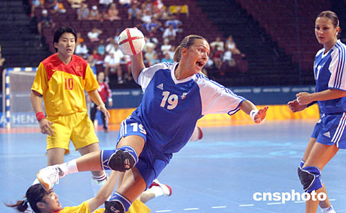 在當地時間8月19日舉行的女子手球比賽中,中國隊以34比13戰(zhàn)勝東道主希臘隊,挺進四強。圖為希臘選手在比賽中射門時的一個鏡頭。