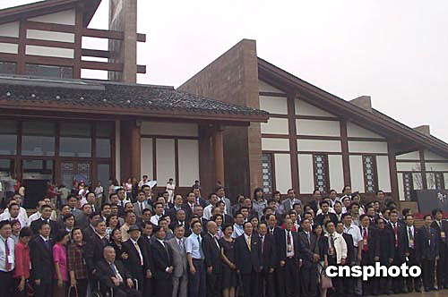今天上午,來自五大洲三十一個(gè)國家的百余名海外華僑華人冒雨參觀鄧小平故居陳列館。在造型獨(dú)具匠心的陳列館前,他們與國務(wù)院僑辦、四川省、廣安市的官員合影留念。作者:楊杰