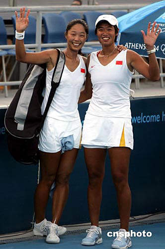 雅典當?shù)貢r間8月20日傍晚,中國網(wǎng)球選手孫甜甜、李婷(前)在半決賽中以九比七戰(zhàn)勝阿根廷選手,歷史性地闖入奧運會女子網(wǎng)球雙打決賽。中新社記者:任晨鳴