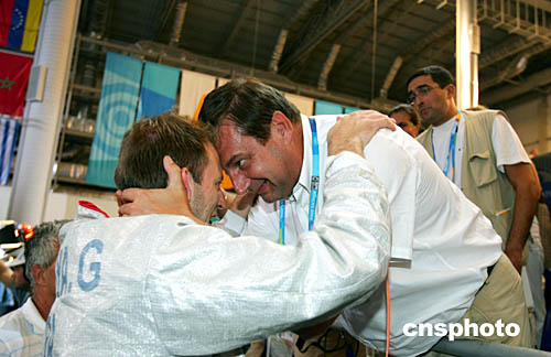 圖為在法國隊奪取男子配劍團(tuán)體冠軍后,法國體育部長拉穆爾擁抱選手的場面。