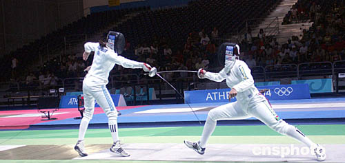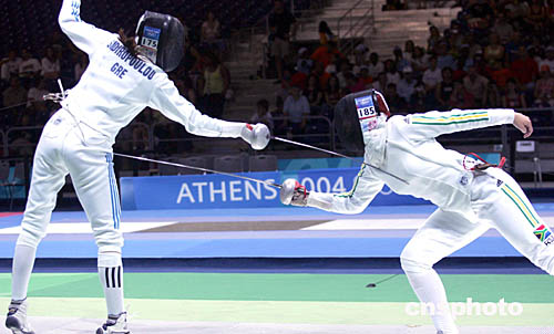 圖為在當(dāng)?shù)貢r(shí)間8月20日舉行的女子擊劍比賽中,希臘選手和南非共和國選手展開激烈對(duì)攻。