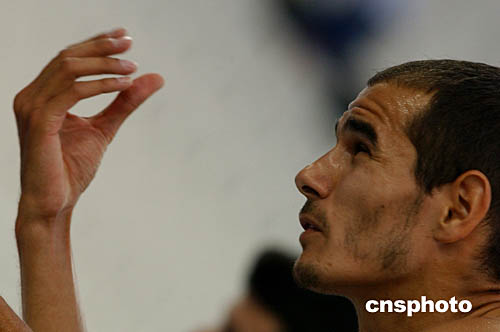 圖為法國(guó)選手巴拉(Mehdi Baala)在男子1500米比賽前為自己鼓勵(lì)加油。