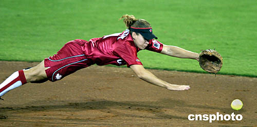 圖為在當(dāng)?shù)貢r間8月19日舉行的加拿大和澳大利亞壘球比賽中,加拿大選手的精彩表現(xiàn)。