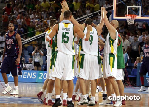 進(jìn)入第四節(jié),夢六隊依然沒有將立陶宛的神準(zhǔn)遠(yuǎn)投放在心上。立陶宛后衛(wèi)賈斯科維修斯在第四節(jié)末段神奇地投入三個三分球,使球隊追平并反超六分。盡管夢六隊此時如夢方醒,但他們的反撲已為時過晚,最后不得不接受雅典奧運的第二場失敗。至此,美國隊小組賽的成績?yōu)槎⻊俣?fù)。