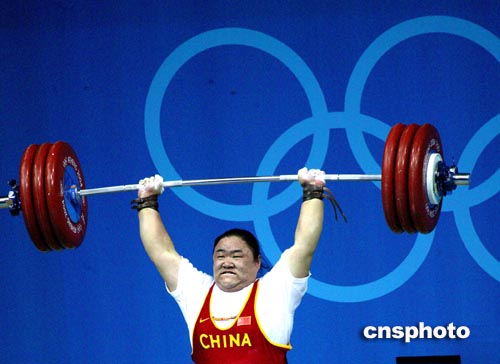 當地時間8月21日,中國選手唐功紅在雅典奧運女子75公斤以上級舉重比賽中,打破挺舉和總成績兩項世界紀錄,奪得該項目的金牌。中新社記者:王瑤
