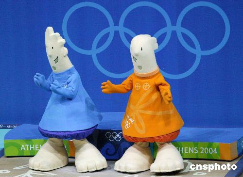 雅典奧運(yùn)舉重男子八十五公斤級(jí)比賽于當(dāng)?shù)貢r(shí)間8月21日晚舉行。比賽間隙,雅典奧運(yùn)吉祥物"雅典娜"和"費(fèi)沃斯"在舉重臺(tái)上表演。中新社記者:宋方燦