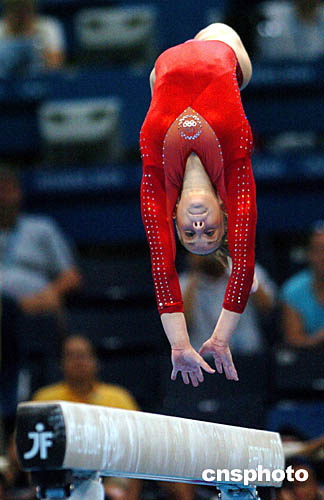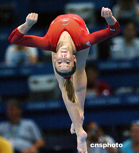 美國選手卡莉(PATTERSON CARLY)在奧運會體操女子全能比賽中,以38.387分獲得金牌。圖為她在比賽時的表現(xiàn)。