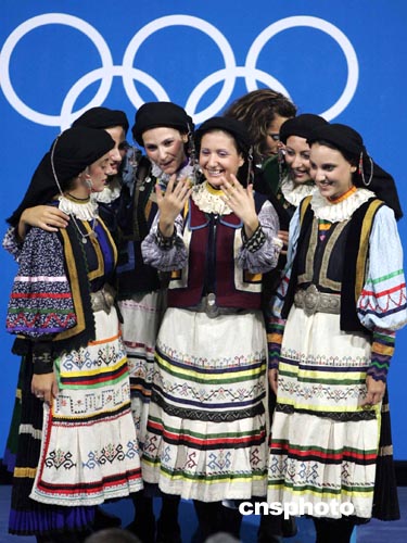 當(dāng)?shù)貢r間八月二十二日下午,雅典奧運會射擊比賽全部結(jié)束,身著民族服裝的頒獎女郎在五環(huán)前留影。中新社記者:毛建軍