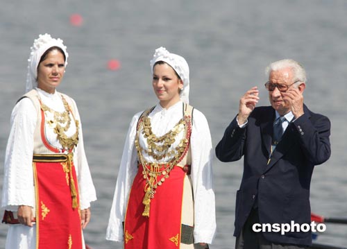 當(dāng)?shù)貢r(shí)間八月二十二日,國際奧委會前主席薩馬蘭奇出席賽艇比賽頒獎(jiǎng)儀式。中新社記者:毛建軍