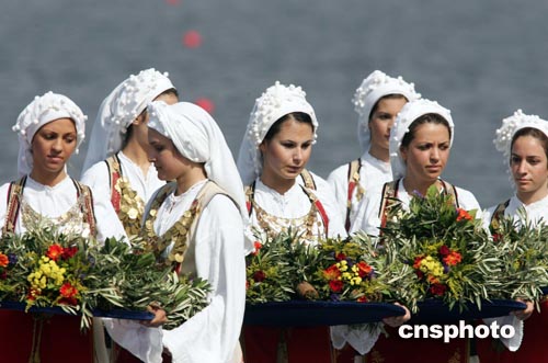 當(dāng)?shù)貢r(shí)間八月二十二日,身著民族服裝的頒獎(jiǎng)女郎在雅典奧運(yùn)賽艇賽場(chǎng)。中新社記者:毛建軍