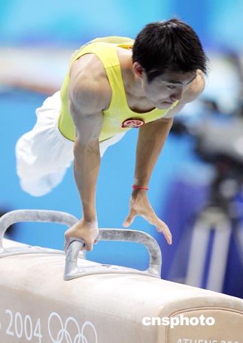 中新社雅典八月二十二日電 (記者 宋方燦)雅典奧運(yùn)會體操鞍馬比賽今天晚上進(jìn)行,中國兩名選手參加了比賽。滕海濱在比賽中發(fā)揮出自己的水平,以九點(diǎn)八三七分摘取金牌。