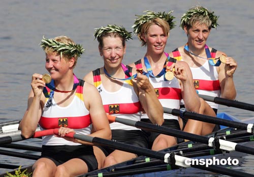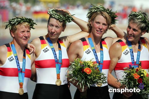 當(dāng)?shù)貢r間八月二十二日,德國隊在雅典奧運女子四人雙槳賽艇比賽中獲得冠軍。中新社記者:毛建軍