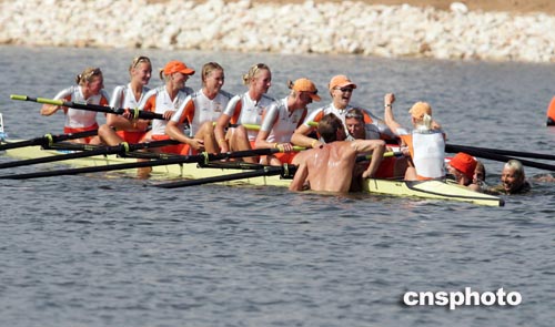 當(dāng)?shù)貢r(shí)間八月二十二日,在雅典奧運(yùn)賽艇賽場(chǎng)觀看比賽的幾名男性觀眾跳入水中賽道,狂吻參賽選手。中新社記者:毛建軍