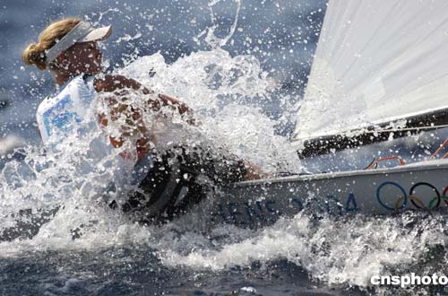 圖為當?shù)貢r間8月20日舉行的帆船帆板女子歐洲級比賽中,挪威運動員Siren的表現(xiàn)。