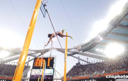 圖為當(dāng)?shù)貢r(shí)間21日舉行的女子撐竿跳資格賽比賽現(xiàn)場(chǎng)。