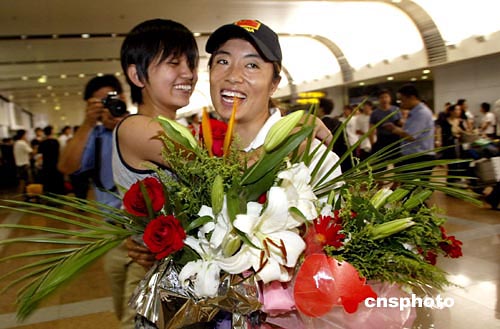 8月23日,在雅典奧運會自行車女子500米計時賽中奪得銀牌的中國老將江永華(右)回到北京,在首都國際機(jī)場受到熱烈歡迎。中新社記者:盛佳鵬