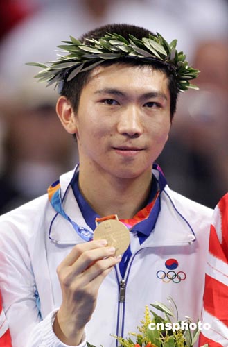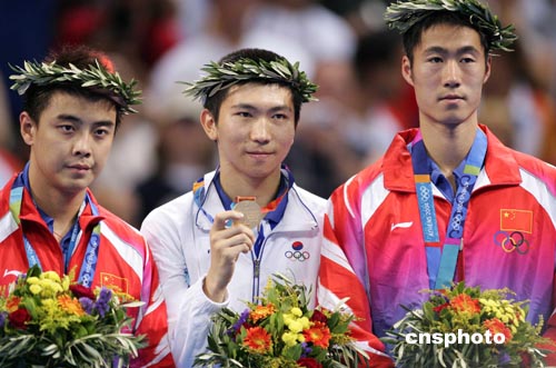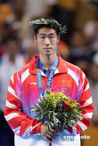 當(dāng)?shù)貢r(shí)間八月二十三日下午,韓國(guó)選手柳承敏在雅典奧運(yùn)乒乓球男子單打決賽中以四比二戰(zhàn)勝中國(guó)選手王皓獲得金牌。中新社記者:毛建軍