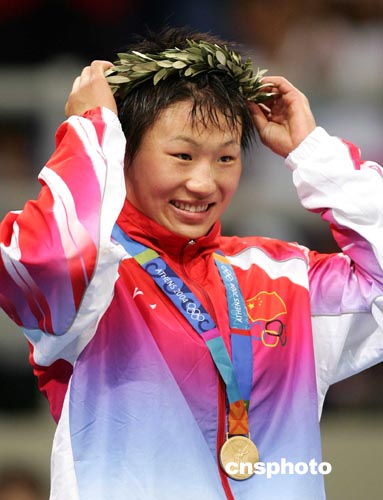 中新社雅典八月二十三日電 雅典當(dāng)?shù)貢r間晚上八點(diǎn)十分,中國十九歲小將王旭在奧運(yùn)會女子摔跤七十二公斤級決賽中以七比二戰(zhàn)勝俄羅斯名將奪得金牌。