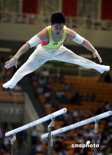 中國(guó)選手李小鵬在團(tuán)體預(yù)賽中兩次試跳起評(píng)分為十分的兩組動(dòng)作,都得到了相同分?jǐn)?shù),以九點(diǎn)八分排在第一,極有希望問鼎冠軍。然而今天第四個(gè)出場(chǎng)的他并未表現(xiàn)出最佳狀態(tài)。第一跳助跑時(shí)他沒有調(diào)整好步伐,落地坐在了墊子上,只有九點(diǎn)零七五分。第二跳中,他使用了“踺子后手翻轉(zhuǎn)體一百八十度接直體前空翻轉(zhuǎn)體九百度”的“李小鵬跳”,動(dòng)作完成得不錯(cuò),只是落地邁了一大步,兩跳平均得到九點(diǎn)三六八分。