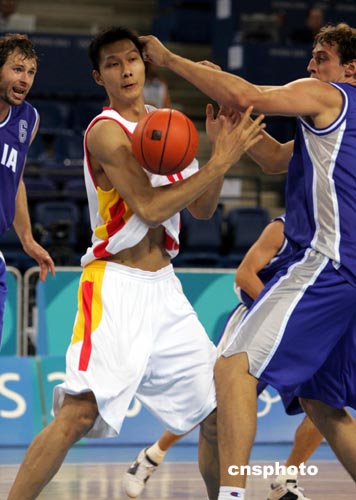 中國(guó)男籃在雅典奧運(yùn)會(huì)小組賽最后一場(chǎng)比賽中以一分險(xiǎn)勝世界冠軍塞黑隊(duì)闖入前八名,首發(fā)新星易建聯(lián)(白衣)上場(chǎng)僅三分多鐘,狀態(tài)依然低迷。賽前被各界一直看好的易建聯(lián)不滿十七歲,被視為最有前途的新星;蛟S是年輕和缺乏經(jīng)驗(yàn),易建聯(lián)的表現(xiàn)令人失望,包括到場(chǎng)的眾多NBA球探和經(jīng)紀(jì)人。中新社記者:任晨鳴