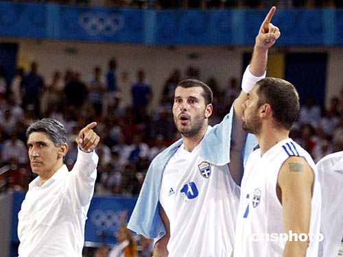 圖為在當?shù)貢r間8月23日舉行的男子籃球賽希臘對陣波多黎哥中,希臘教練Panagiotis GIANNAKIS指揮隊員們比賽的場景。