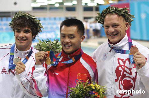 中國選手彭勃獲得雅典奧運男子三米跳板跳水金牌,加拿大名將德斯帕蒂獲得銀牌,俄羅斯老將獲得銅牌。中新社記者:毛建軍