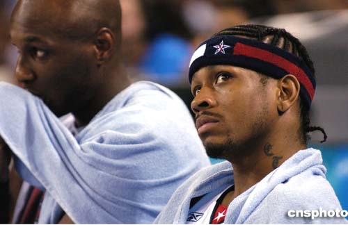 圖為在當(dāng)?shù)貢r間23日舉行的籃球預(yù)賽中,美國主力球員艾弗森被換下場休息,但他仍緊緊關(guān)注著場上形勢的變化。