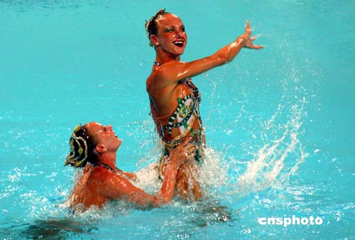當?shù)貢r間8月24日晚,美國隊在雅典奧運會進行雙人花樣游泳比賽。中新社記者:王瑤