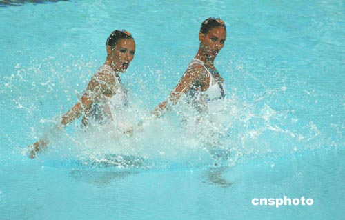當?shù)貢r間8月24日晚,埃及隊在雅典奧運會進行雙人花樣游泳比賽。中新社記者:王瑤