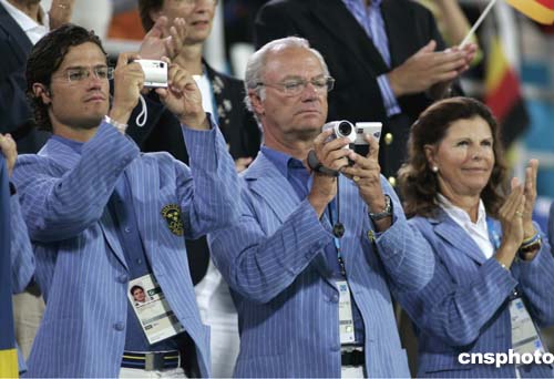 在當(dāng)?shù)貢r(shí)間24日舉行的馬術(shù)障礙賽團(tuán)體賽頒獎(jiǎng)典禮上,瑞典國王Carl Gustav,王后Silvia和菲利普王子用微型攝像機(jī)拍攝頒獎(jiǎng)的場面。