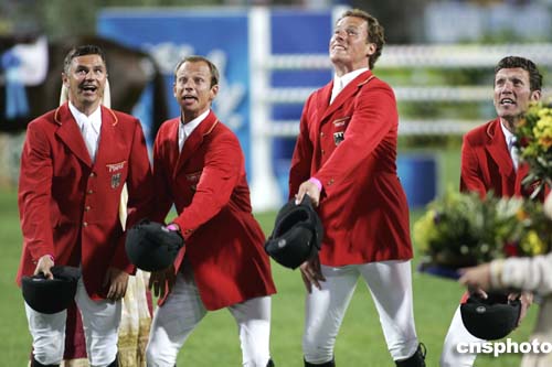 在當(dāng)?shù)貢r(shí)間8月24日進(jìn)行的馬術(shù)障礙賽團(tuán)體賽中,德國(guó)隊(duì)榮獲第一,這是他們的隊(duì)員Otto Becker, Marco Kutscher,Christian Ahlmann和Ludger Beermaun(從左到右)慶祝的場(chǎng)面。