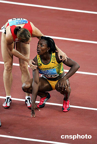 圖為在女子200米決賽中美國選手阿森-菲利克斯(Allyson Felix)問候牙買加選手坎貝爾(Veronica Campbell)。