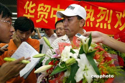 8月26日,北京首都國際機(jī)場又迎來一批載譽歸來的奧運健兒,包括羽毛球、乒乓球、游泳、體操、舉重等200多名選手,他們在機(jī)場受到英雄般的歡迎,幾乎每個人都被鮮花包圍。圖為中國羽毛球隊總教練李永波甫抵機(jī)場就成為記者采訪焦點。中新社記者:盛佳鵬