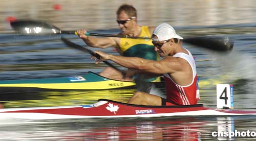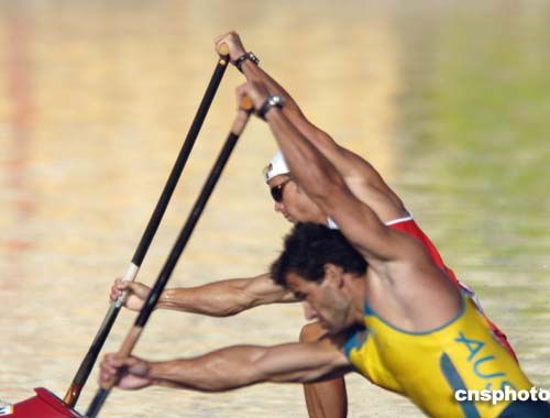 圖為當(dāng)?shù)貢r(shí)間25日舉行的男子皮劃艇單人1500米半決賽中,RICHARD DALTON和MARTIN MARINOV力拼對(duì)手的場(chǎng)景。最終Dalton因比MARINOV快半秒而獲得了第三名和一個(gè)決賽資格。
