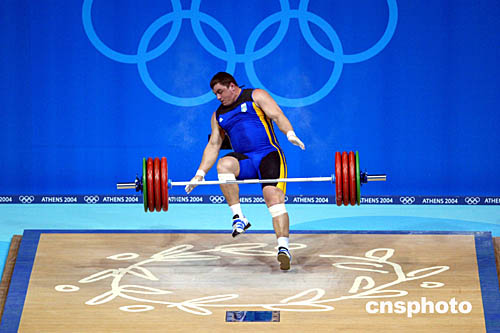 圖為烏克蘭選手Oleksiy Kolokolstev在男子105公斤級舉重比賽中試舉失敗的鏡頭。