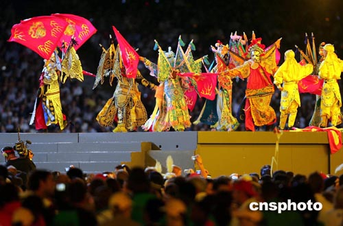 展現(xiàn)中國文化,京劇不可或缺。來自大連的十三歲少年汪宇,與另外五名同學(xué)揮舞旌旗表演了武戲。隨后,一個巨大的紅燈籠狀舞臺緩緩升起,一名中國小女孩清唱《茉莉花》,“welcome to beijing”,她純真、清脆的聲音表達出中國人民最衷心的愿望。