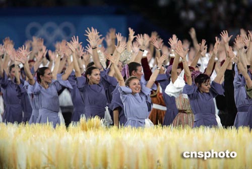 在由四萬(wàn)五千多片金黃的麥穗裝點(diǎn)的舞臺(tái)上,伴隨希臘傳統(tǒng)音樂(lè)和特色民歌,在色彩斑斕的玻璃馬賽克鋪就的道路上,人們翩翩起舞,展示著雅典人收獲的喜悅,表達(dá)他們對(duì)奧運(yùn)會(huì)的祝福。