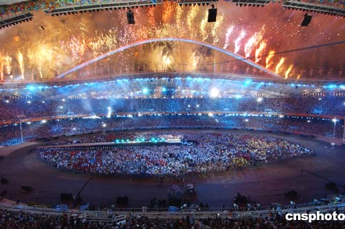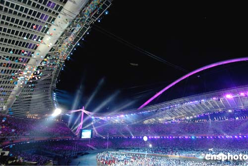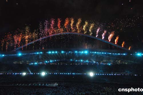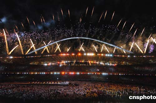 在當(dāng)?shù)貢r(shí)間29日舉行的2004雅典奧運(yùn)會閉幕式上,焰火在奧林匹克運(yùn)動場上空綻放。