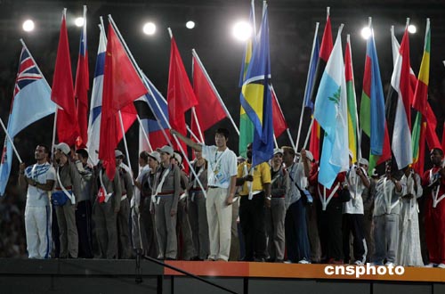 雅典當(dāng)?shù)貢r(shí)間八月二十九日晚,雅典奧運(yùn)會(huì)閉幕式在奧林匹克主體育場隆重舉行,在本屆奧運(yùn)會(huì)奪得男子110米欄金牌的中國飛人作為中國體育代表團(tuán)旗手,步入會(huì)場。中新社記者:毛建軍