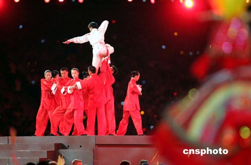 當(dāng)?shù)貢r(shí)間八月二十九日,第二十八屆奧林匹克運(yùn)動(dòng)會(huì)在雅典圓滿(mǎn)結(jié)束。圖為中國(guó)演員在閉幕式上表演節(jié)目。中新社記者:毛建軍