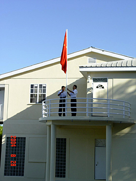 中新網(wǎng)8月30日電 據(jù)中國外交部網(wǎng)站消息:8月25日,中國駐多米尼克國大使館正式進(jìn)駐大使館館舍。8月26日清晨,王新平臨時(shí)代辦和王勇三秘第一次在使館升起鮮艷的五星紅旗。