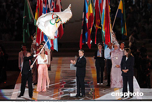 圖為北京市長(zhǎng)王岐山從奧委會(huì)主席羅格手中接過(guò)奧運(yùn)會(huì)旗,歡迎大家2008年到北京來(lái)。