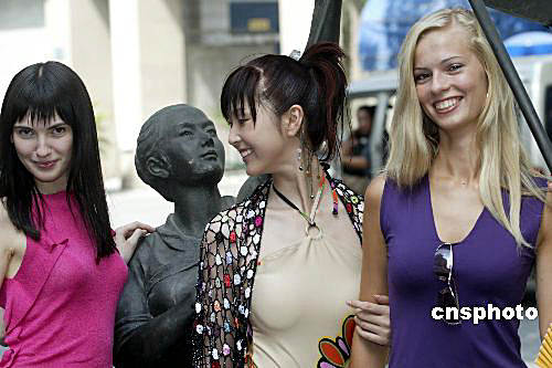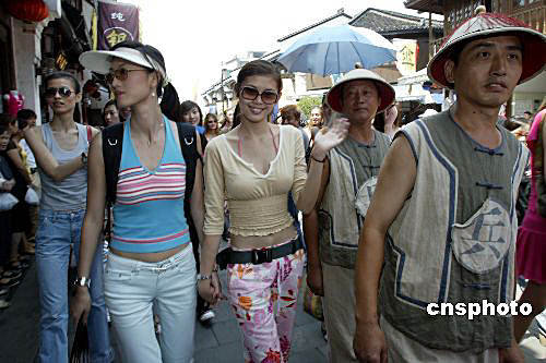 8月30日,參加2004年新絲路世界模特大賽的二十九個(gè)國(guó)家和地區(qū)的四十多名選手齊聚浙江省杭州市,開始她們的時(shí)尚杭州之旅,大賽組委會(huì)組織參賽佳麗們游覽西湖、乘船沿運(yùn)河觀光,逛杭州著名的河仿街和絲綢城,夜晚竹海漂流,使模特們進(jìn)一步貼近杭州,貼近市民生活。大賽決賽將與9月5日在杭州舉行。中新社記者 盛佳鵬 攝