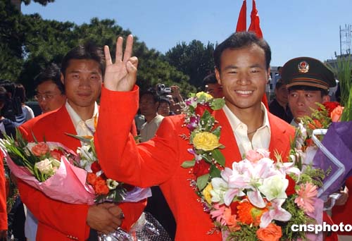 八月三十一日,中國(guó)奧運(yùn)健兒載譽(yù)回國(guó),在北京首都國(guó)際機(jī)場(chǎng)受到熱烈歡迎。圖為男子500米雙人劃艇奧運(yùn)冠軍孟關(guān)良、楊文軍步出機(jī)場(chǎng)。中新社記者:武仲林