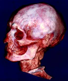 在實(shí)施木乃伊面容復(fù)原計(jì)劃時(shí),由菲德瑞克博士領(lǐng)導(dǎo)的專家小組選中了一個(gè)3000歲的木乃伊。他生活在公元前945-前715年,生前是一個(gè)技術(shù)工人。該木乃伊于1900年在皇后谷地區(qū)被發(fā)掘出來,隨后又被送入埃及博物館!笆中g(shù)”過程中,科學(xué)家們把木乃伊置于掃描儀上,以平均每27.4秒顯示335幀圖像的速度進(jìn)行掃描。所有的圖像都被存入電腦的記憶系統(tǒng)中,最后使用特殊軟件在電腦中將裹尸布揭去。隨后,科學(xué)家們根據(jù)圖像數(shù)據(jù),運(yùn)用整形技術(shù)將頭骨復(fù)原。最后,他們以暴露在木乃伊裹尸布之外的面部皮膚和肌肉作為參照依據(jù),用特殊材料制作成面部肌肉、耳朵、嘴巴等。