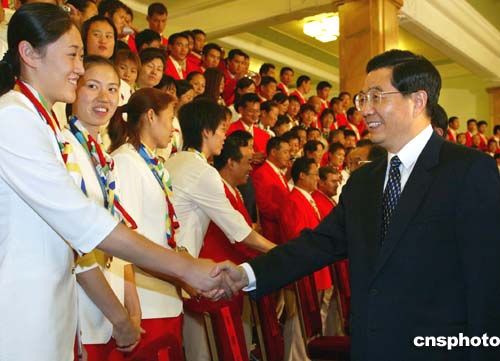 九月二日,中國國家主席胡錦濤等黨和國家領(lǐng)導(dǎo)人在北京人民大會堂接見了剛剛從雅典歸來的中國體育代表團(tuán)全體成員、后勤工作人員及參與報(bào)道工作的新聞工作者代表。中新社記者:鄭萍萍
