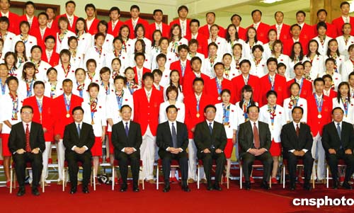 中國國家主席胡錦濤等黨和國家領(lǐng)導(dǎo)人在北京人民大會堂接見了剛剛從雅典歸來的第28屆中國體育代表團(tuán)全體成員并合影留念。中新社記者:鄭萍萍