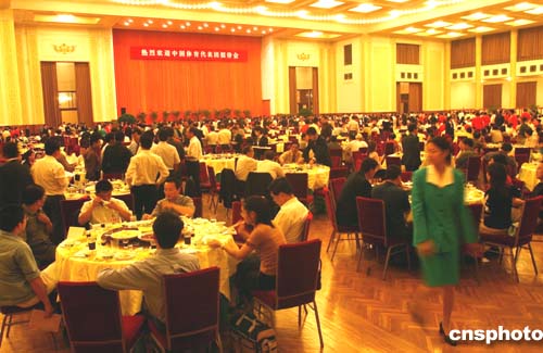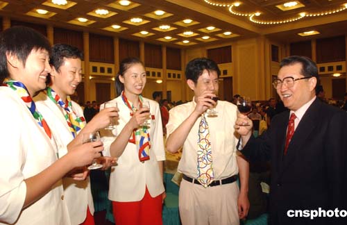 九月二日晚,中共中央辦公廳、國(guó)務(wù)院辦公廳在北京人民大會(huì)堂宴會(huì)廳舉行招待會(huì),歡迎載譽(yù)歸來的第28屆奧運(yùn)會(huì)中國(guó)體育代表團(tuán)。中共中央政治局常委、國(guó)家副主席曾慶紅向獲得奧運(yùn)冠軍的中國(guó)女排祝酒。中新社記者:武仲林