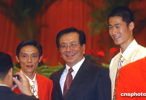 中共中央政治局常委、國(guó)家副主席曾慶紅與中國(guó)乒乓隊(duì)陸元盛、王勵(lì)勤合影留念。中新社記者:武仲林