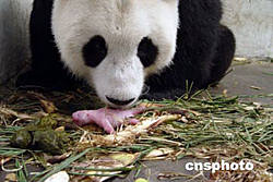 據(jù)了解,今年八月剛滿五歲的“華美”一九九九年出生于美國圣地亞哥動物園,今年二月十三日回到四川臥龍定居,它是采用人工授精技術(shù)在美國出生并存活的第一只熊貓幼仔。今年四月下旬,已是個“大姑娘”的“華美”發(fā)情后,專家們特地為“華美”找了個“如意郎君”大熊貓“靈靈”。五月二日,這兩只大熊貓成功地實現(xiàn)了本交。為增加“華美”受孕的成功機率,科研人員在本交后的幾天里又對她進行了四次人工授精!叭A美”終于成功懷孕產(chǎn)仔。